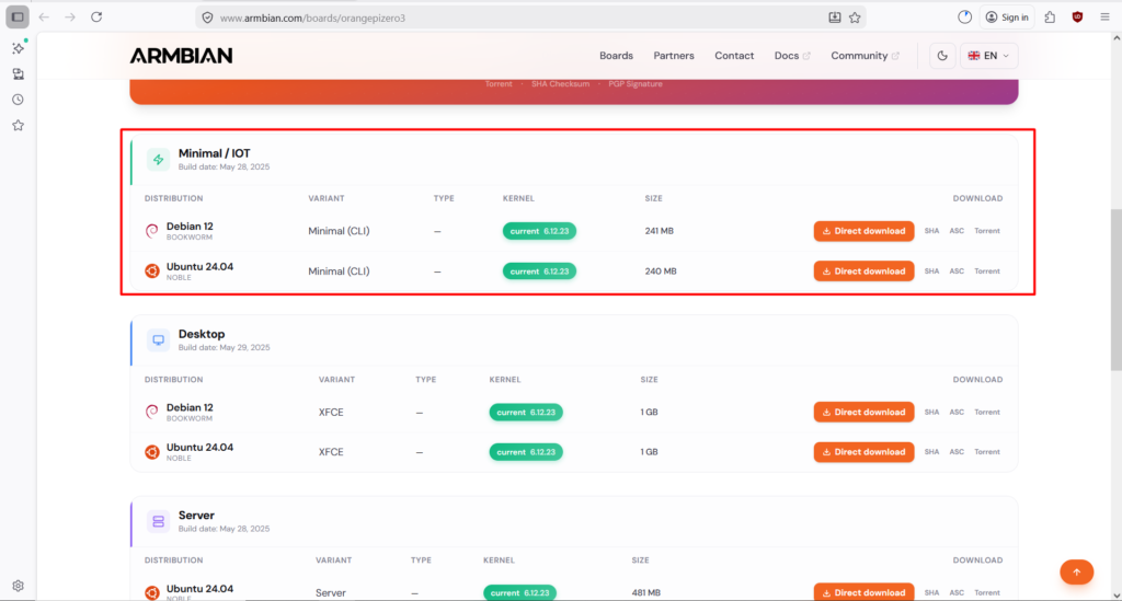 4. Saat ini memilih Debian 12 dan klik Direct Download pada tab Minimal / IOT.