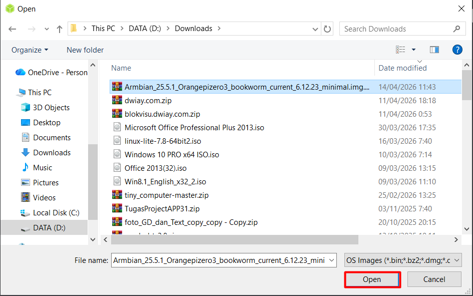 7. Pilihlah file Armbian Image yang sudah diunduh tadi, klik Open.