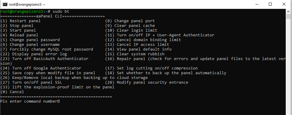 9. Ketikkan kode perintah untuk melihat fitur yang ada di dalam Aapanel