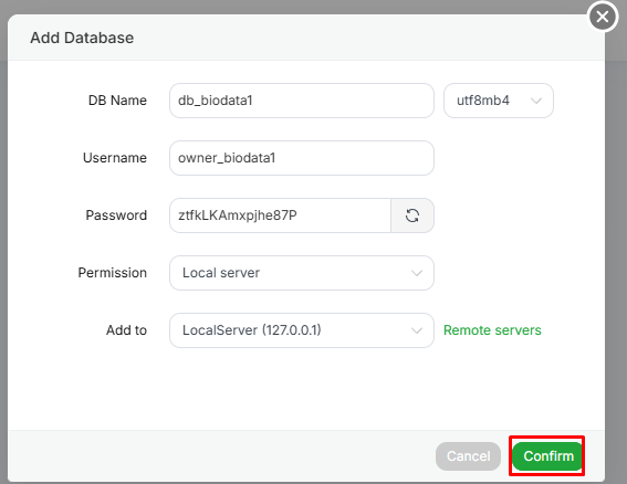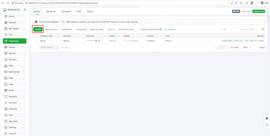 7. Klik Add DB untuk membuat database MySQL baru.